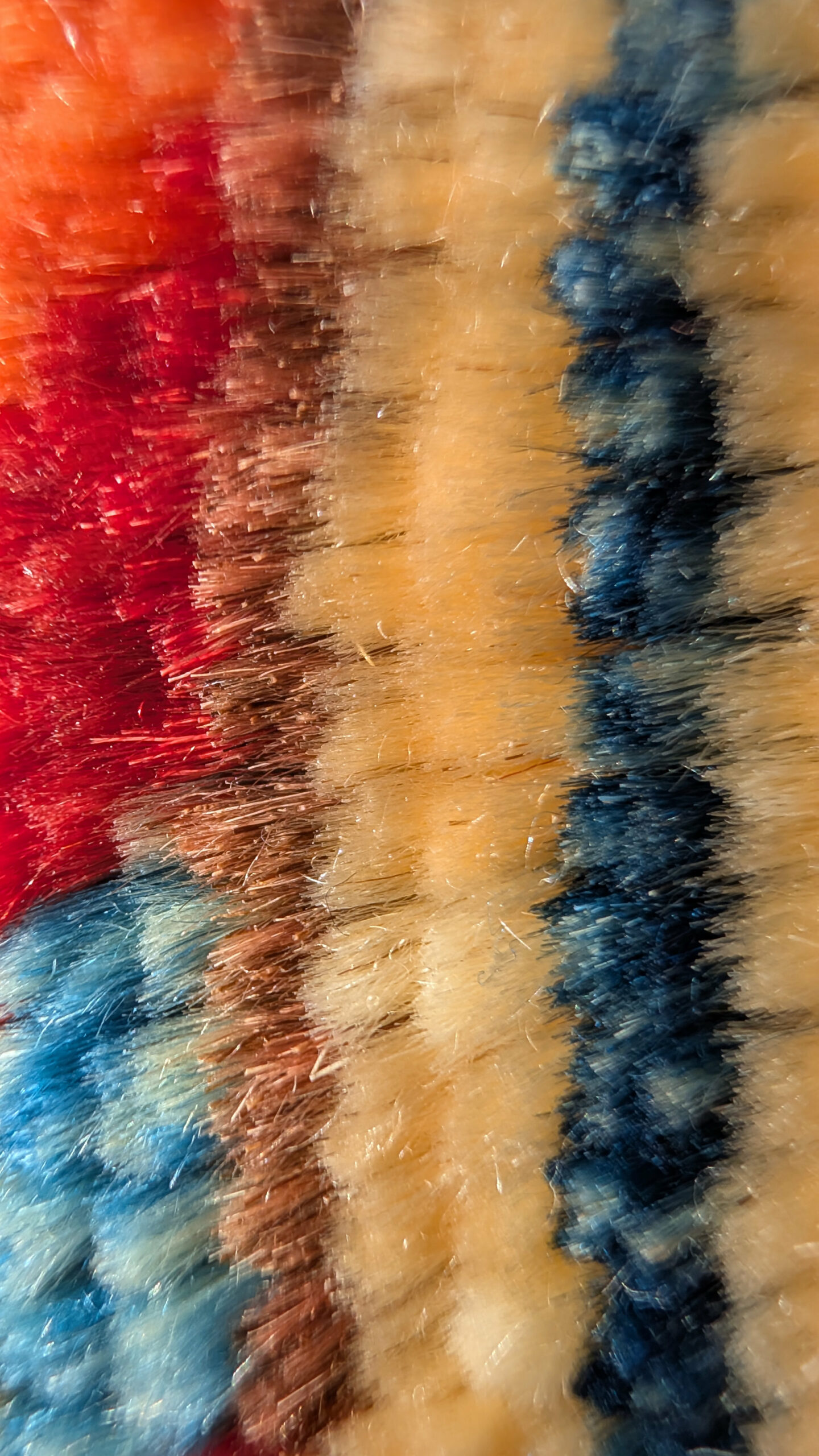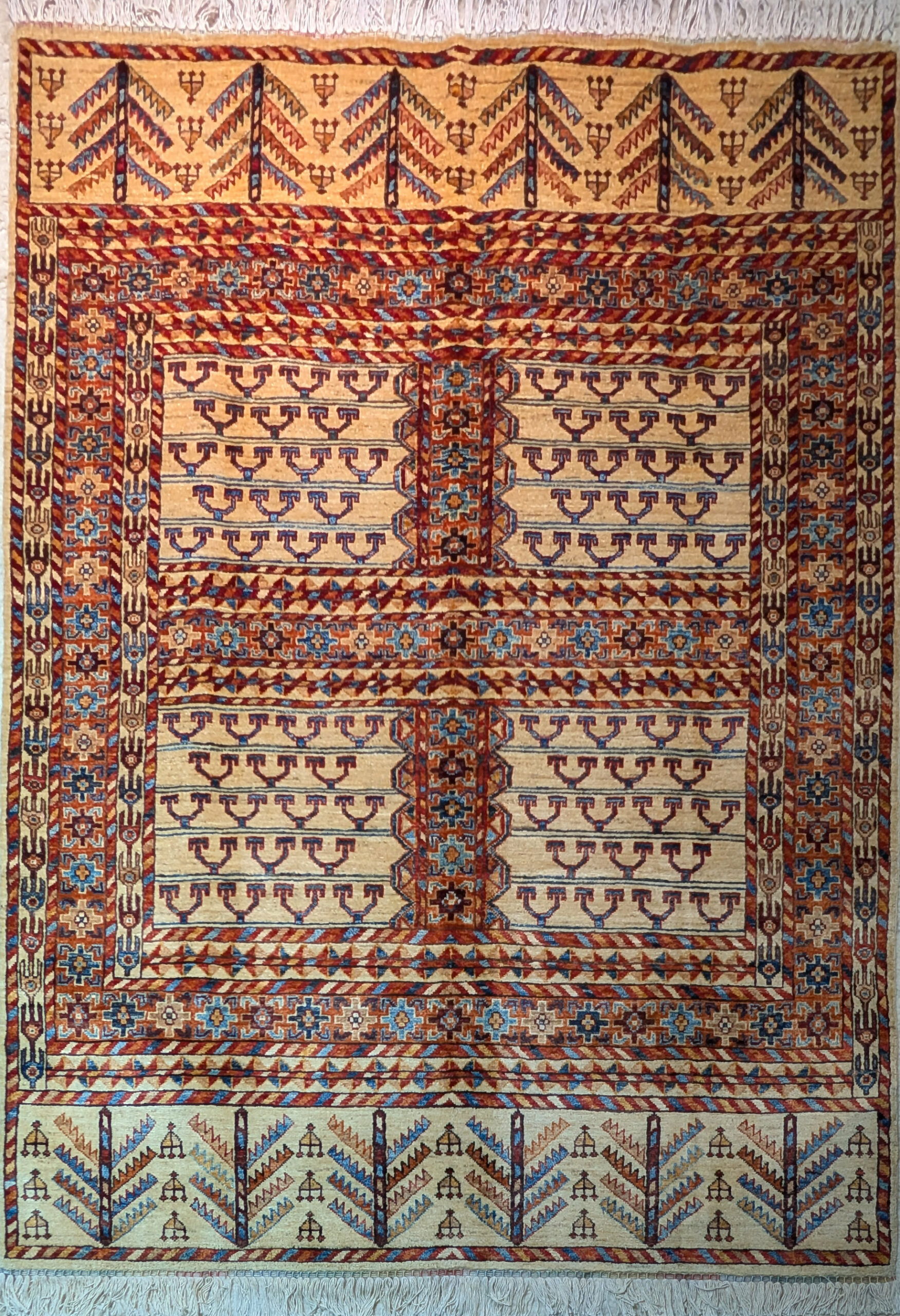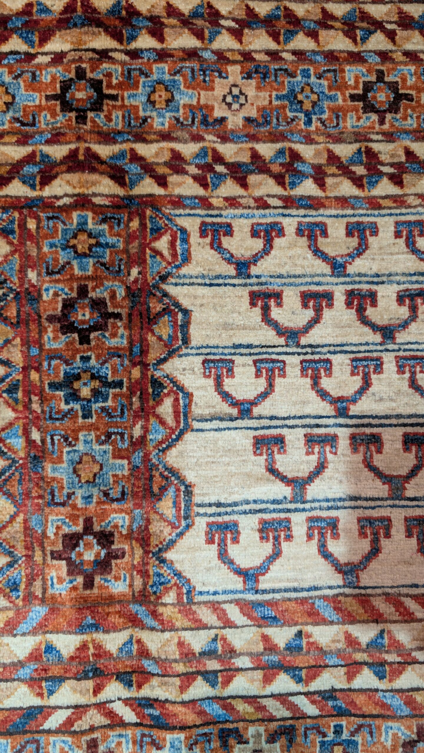 Ce tapis se distingue par sa composition géométrique fascinante : de superbes arbres de vie stylisés ornent les extrémités, tandis que le centre est rythmé par des motifs tribaux répétés avec une grande précision. Sa palette de couleurs est un régal pour les yeux, mariant un fond crème lumineux et chaleureux à des nuances de rouille, de bordeaux, et de subtiles touches de bleu ciel. Entièrement fait main en pure laine, il vous garantit une épaisseur confortable et une qualité exceptionnelle.